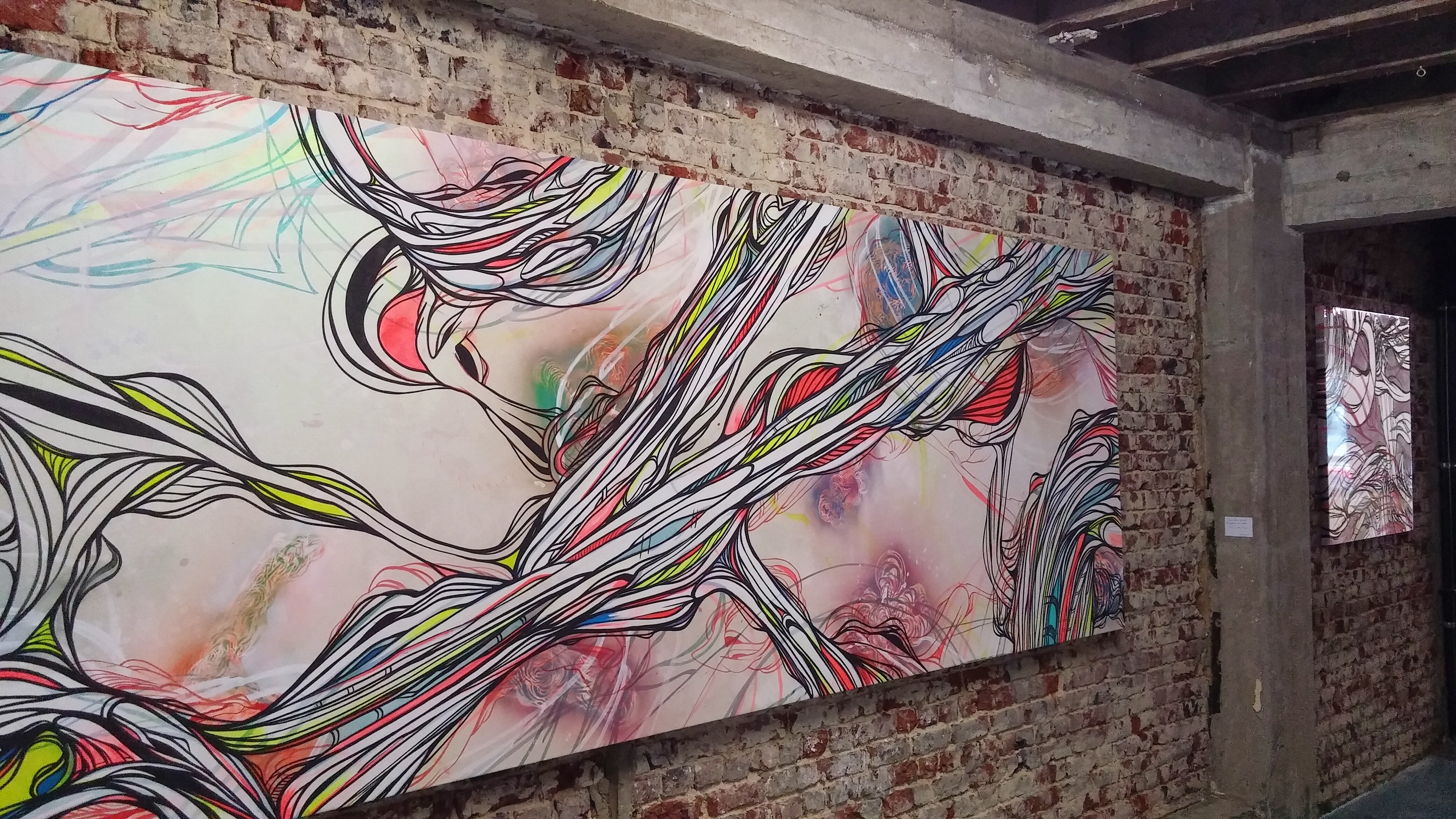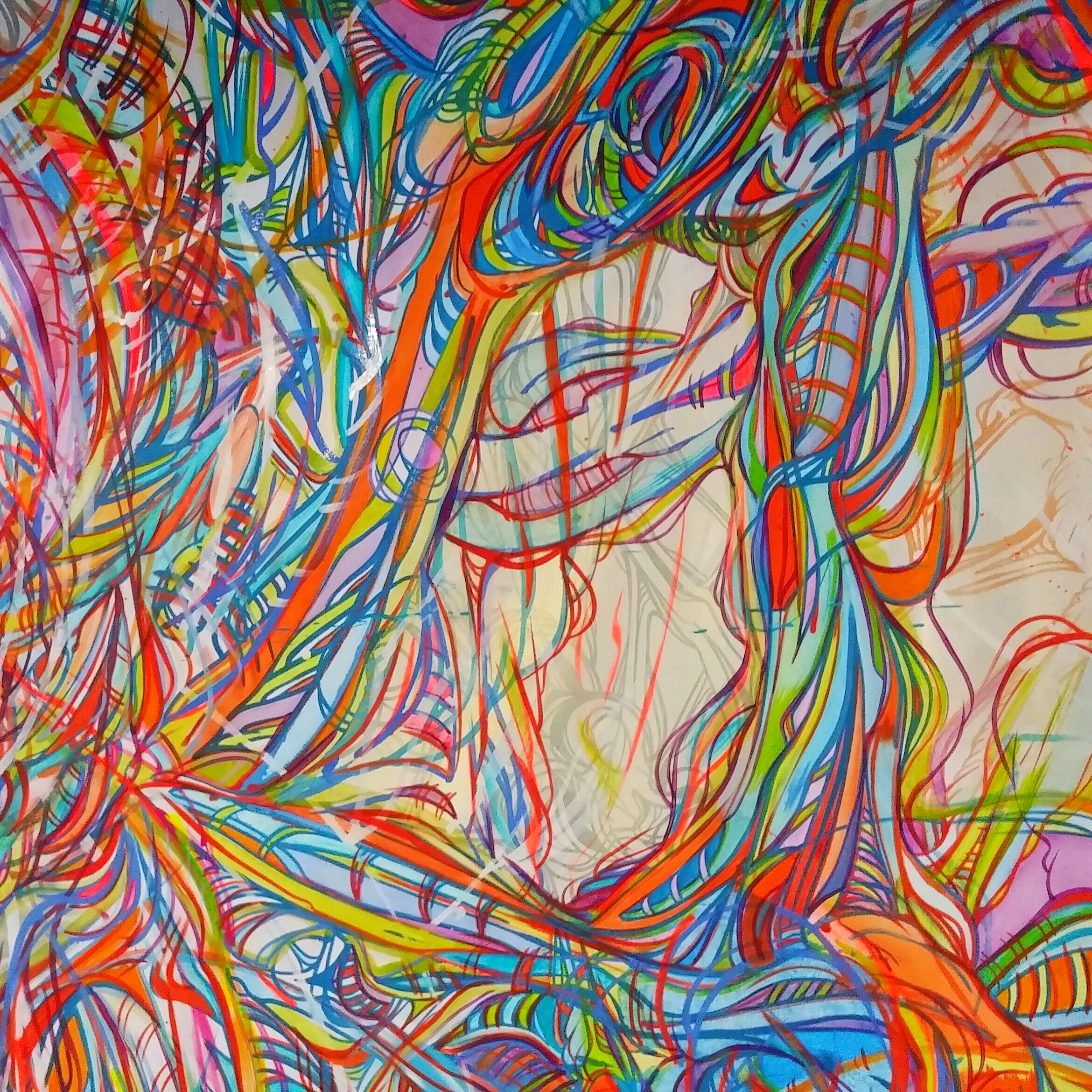 Organique et vivace ! Les flux entrelacés, aux couleurs éclatantes, semblent glisser les uns sur les autres, s’entremêler, gonfler, pulser, grouiller. Comme dans un désir de se propager et de prendre possession de l’espace.