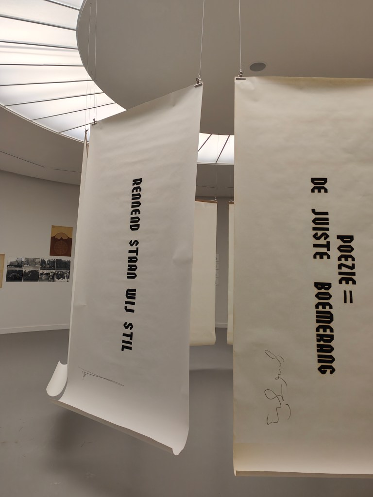 Au centre, des slogans poétiques d’auteurs anversois imprimés grâce à Pionneer (1981), une machine à imprimer fonctionnant à l’énergie solaire et inaugurée le vendredi 8 mai 1981 au centre culturel international ICC d’Anvers.
